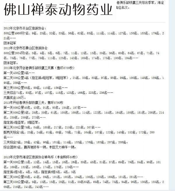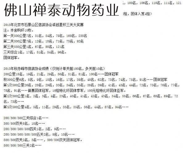 佛山禅泰动物药业爆灯鸽药经过多年的沉淀和推广,产品效果获得了全国广大鸽友尤其是高端赛鸽高手的认可与喜爱,我司鸽友沙龙会员——内蒙古赤峰市金翔家园李岩东先生,近年来转战北京,在高手如云的京城赛事中,以一流的赛鸽质量、非凡的饲养训放手法,同时科学运用爆灯鸽药调控赛鸽,取得了骄人的赛绩!现将金翔家园近两年来的赛绩录制如下,供广大鸽友参考,也欢迎广大赛鸽高手和我们交流,期望爆灯鸽药给鸽友带来竞翔的非凡感受!